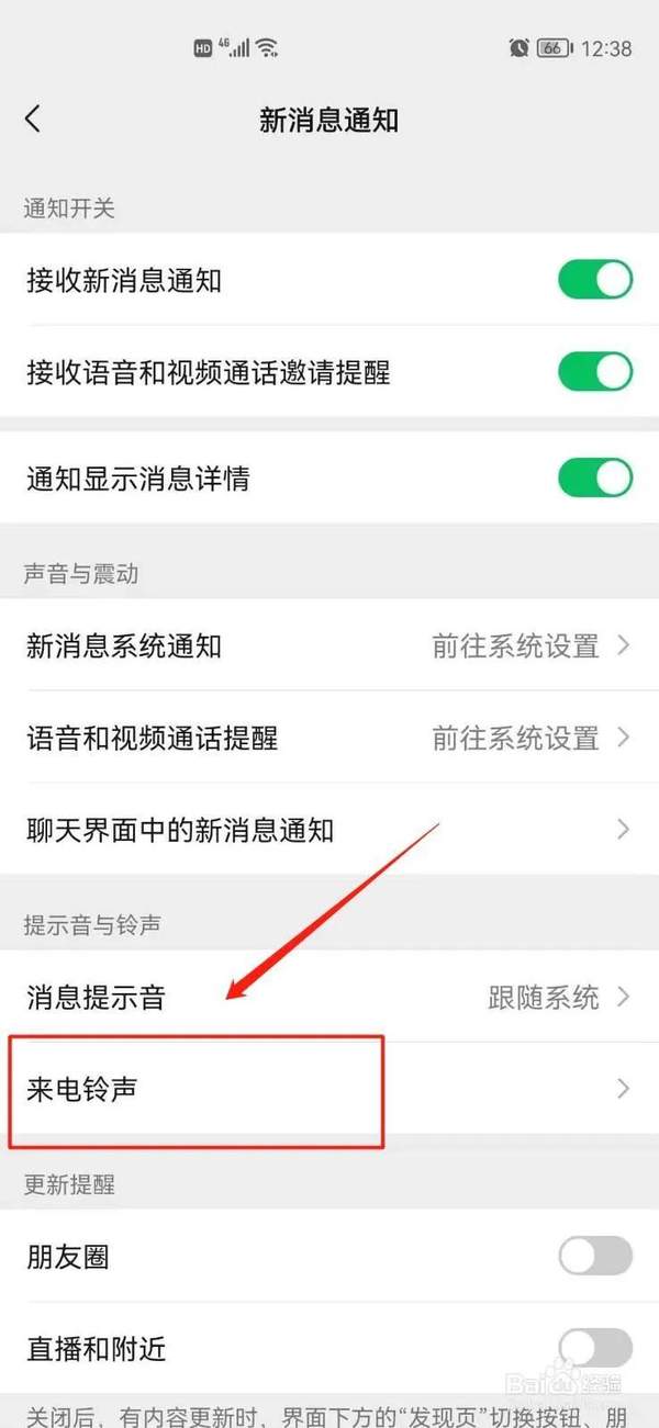 3/4设置来电铃声点击来电铃声,自定义设置微信语音/视频来电铃声。