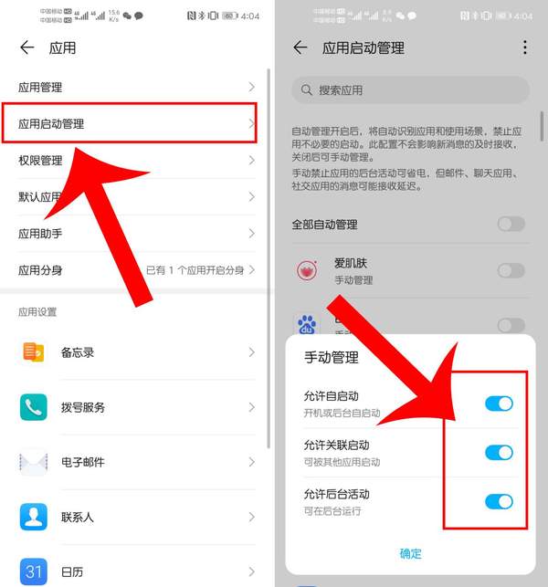 由于各手机品牌不一,所以这里笔者给大家提供一个大概的设置方法:设置→应用→应用启动管理→将微信自启动、关联启动、后台活动按钮都开启。