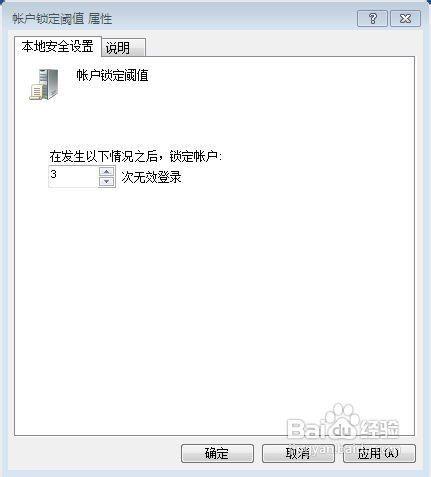 打开帐户锁定阀值,设置无效登陆次数,(比如设置3次无效登陆次数,如果你输入登陆3次错误,那么你帐户将锁定!)设置以后选择确定。