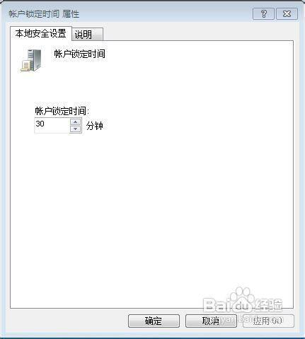 打开帐户锁定时间,设置帐户锁定时间,设置后选择确定。