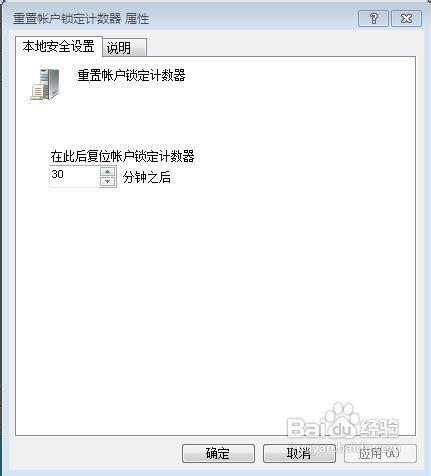 打开重置帐户锁定计数器,设置在多少分钟之后复位帐号锁定计数器,设置后选择确定。