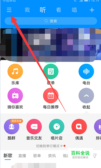 打开手机酷狗音乐,进入之后选择红色箭头处的图标位置点击即可。