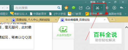 【截图功能】启动QQ浏览器,在浏览器的右上角能找到“剪刀”图标,这就是浏览器的截图功能按钮。如下图: