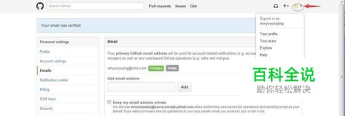 成功之后我们再回来到这个注册网站 会看到下图 就是你的邮箱状态现在为primary 就是首要,但是pubilc (公开)为灰色,下面的步骤我们将要把public点亮,点击右上角你的头像,进入settings(设置)页面