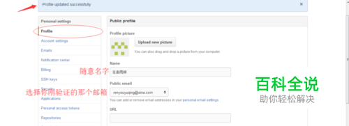 我们来点击个人设置的第一个,就是profile(简介)这里,在name处随便写个名字,然后在下面的public email选择你的这个邮箱,然后我们点击最下面的profile update(更新简介),这步就完成了