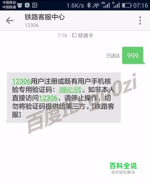从手机上,接到铁路客服中心的短信,从中取得 专用验证码 (7:16)