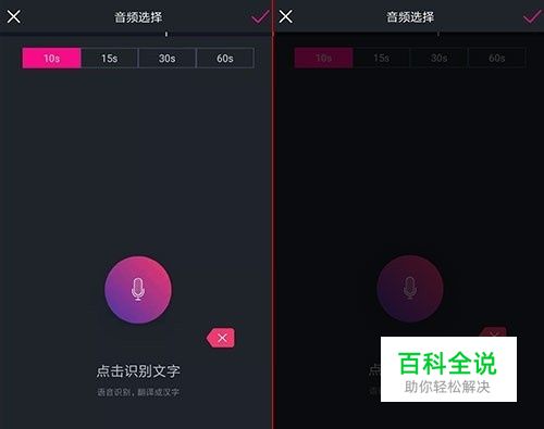 文字视频制作页面,由于新的抖音账户有15s的时长限制,可以在上方选择好时间再制作,避免过长无法上传。 点击中间的话筒进行录制或者在下方导入音频/视频,视频文件软件会帮你智能提取出音频,点击右上角对勾,合成跳转到预览页面。