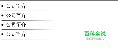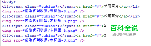 这时我们要修改一些内容了,使其和样式进行结合。代码为: <body> <li class="l-title" ><span class="tubiao"><img src="前端代码收集/未标题-4.png"</span><a href="#">公司简介</a></li> <img src="前端代码收集/未标题-3.png" /> <li class="l-title" ><span class="tubiao"><img src="前端代码收集/未标题-4.png"</span><a href="#">公司简介</a></li> <img src="前端代码收集/未标题-3.png" /> <li class="l-title" ><span class="tubiao"><img src="前端代码收集/未标题-4.png"</span><a href="#">公司简介</a></li> <img src="前端代码收集/未标题-3.png" /> <li class="l-title" ><span class="tubiao"><img src="前端代码收集/未标题-4.png"</span><a href="#">公司简介</a></li><img src="前端代码收集/未标题-3.png" /> </body>