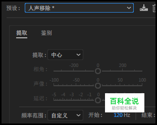 在操作面板预设这里,点下拉按钮,弹出列表中选择:人声移除 再在:中心声道电平,这里的滑块移到最底下