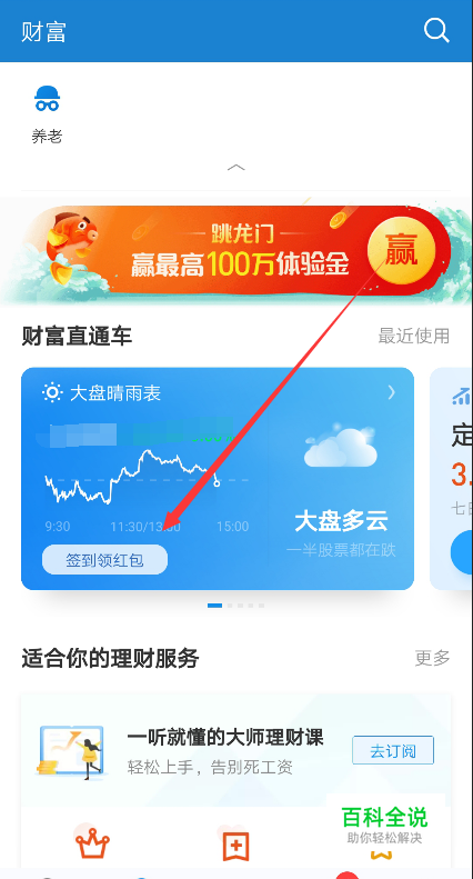 在财富界面中部的财富直通车就可以看到有个大盘晴雨表,直接点击进入,如下图所示。