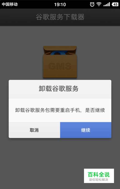 进入“谷歌服务下载器”,点击“卸载谷歌服务包”;选择继续,即可卸载