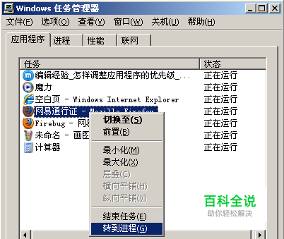 弹出的菜单最下方有一个《转到进程》选项,在《转到进程》上单击右键!就会转到你需要调整的应用程序的具体进程上!