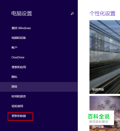 在点击【更改电脑设置】后弹出的界面下,选择【更新和恢复】选项。(如图所示)