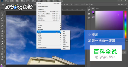 我们左键单击“滤镜”,点击“扭曲”,点击“波纹”。