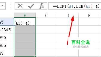 2;在编辑栏中输入:=LEFT(A1,LEN(A1)-4)再按CTRL+回车键。
