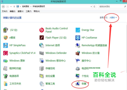 在控制面板中找到【恢复】,刚进去的图标是比较小的,你可以在右上角选择将图标用大图标显示,这样就可以很容易找到【恢复】了,如下图所示。