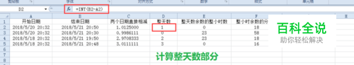 便于理解先分步计算出天数(即整数部分),和把小数部分转换为小时数,和分钟数。 1.整天数:=INT(B2-A2) 2.整小时数:=INT((B2-A2-INT(B2-A2))*24) 3.分钟数:=ROUND(((B2-A2-INT(B2-A2))*24-INT((B2-A2-INT(B2-A2))*24))*60,0)
