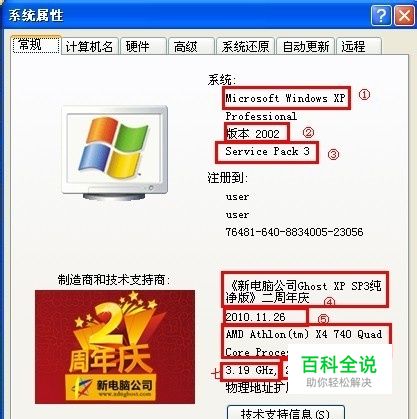 标注②代表的是:什么类型版本的,上图代表的的是专业版的。还有OEM版之类的。以及系统上市时间2002年。