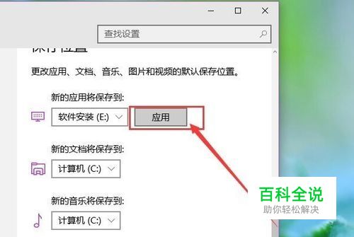 在点击选择好应用的存储位置之后,在设置页面右侧 点击“应用”按钮,然后就可以使该设置项目生效,至此我们就已经成功更改了应用的默认安装位置,以后在安装Modern应用时,会自动安装到所设置的分区。