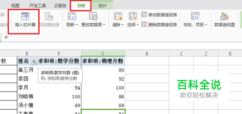 第二步点击数据透视表,在分析界面中,点击插入切片器,如下图所示: