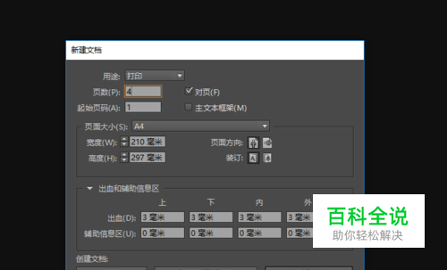 打开ID软件,小编这用的是IDCC2015的版本,它会跳出一个新建的页面框,我们先将页数设置为4,点击确认即可。