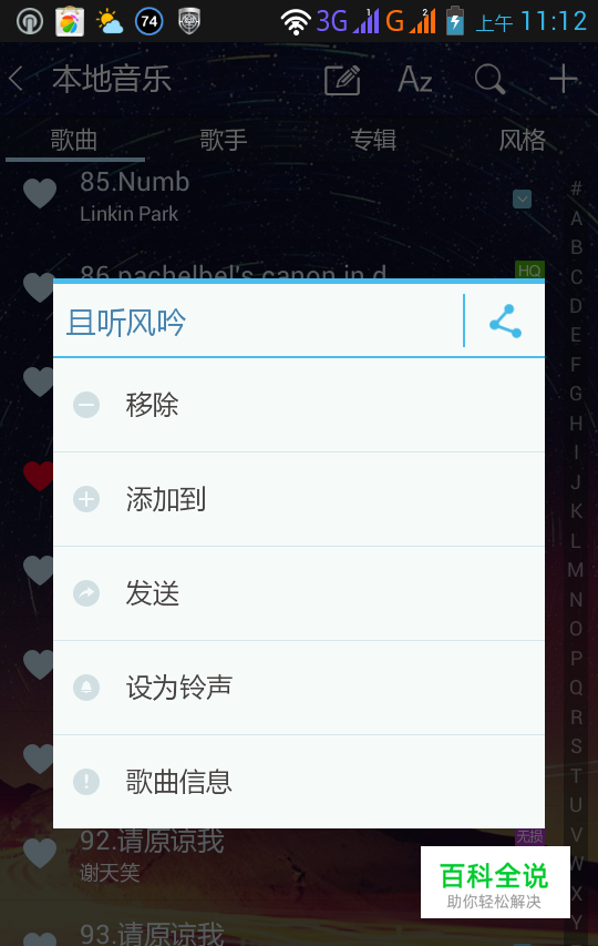 使用音乐软件进行设置。在音乐播放器的列表里,长按想要设置的条目会弹出选项,选择相应的条目即可。用我的音乐播放器上个图,其他的也都大同小异。 这种方法的优点是便捷,可以随时随地的简单的进行设置,但是也存在很大的弊端,每次关机后这种设置就失效了,需要重新设置。