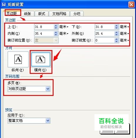 打开“页面设置”对话框,在“页边距”选项卡中,设置页边距(根据实际需要设置)、方向(选择“横向”)、页面范围(多页选择“对称页边距”)。