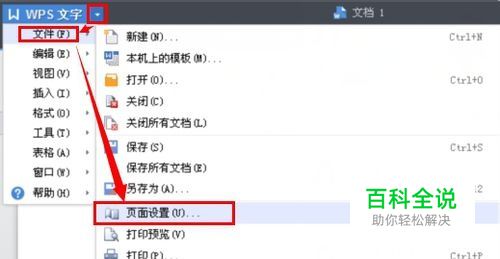 启动WPS文字,新建一空白文档,然后单击WPS左上角的图标(三角号),然后依次选择“文件”—“页面设置”。