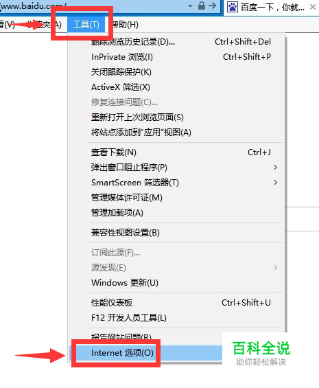 打开IE浏览器,左键单击,点击“工具”菜单,选择“Internet选项”