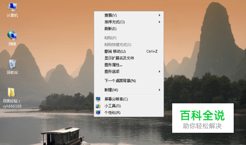 在桌面的空白处点击鼠标右键,主要不要在其它图标上面点击鼠标右键,点击右键后就打开如下图所示的右键菜单