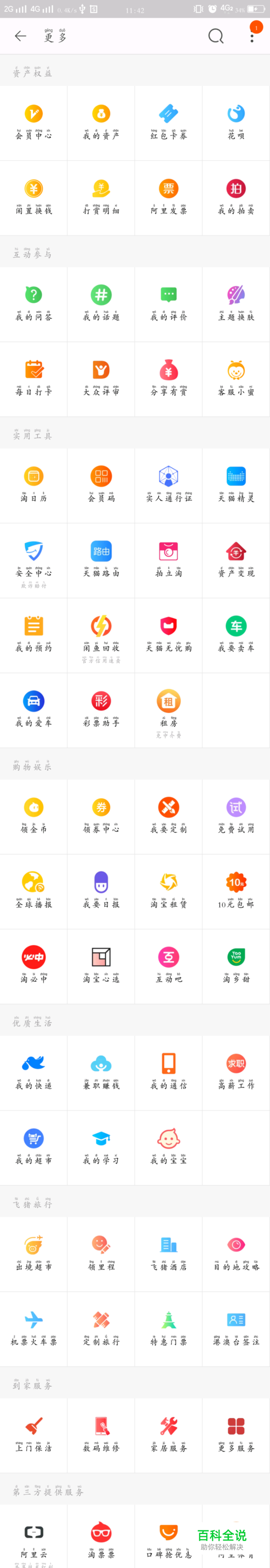 第一步,打开你的淘宝。选择到 “我的淘宝 ”界面——>点击页面中 “更多” 会显示很长一个页面。在这个页面的最下面选择 “饿了吗”