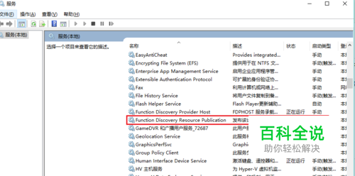 然后Win+R搜索“services.msc”或者直接左下角小娜里搜索“服务”,找到function discovery resource publication服务设为自动、开启。