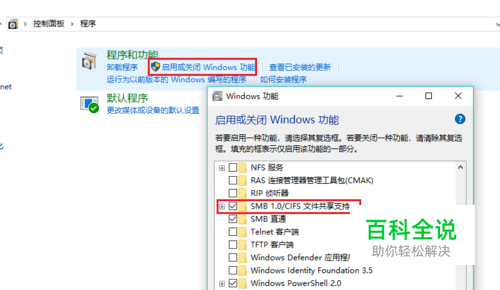 首先找到控制面板->程序->启用或关闭Windows功能->找到 smb 1.x 。勾选确认。