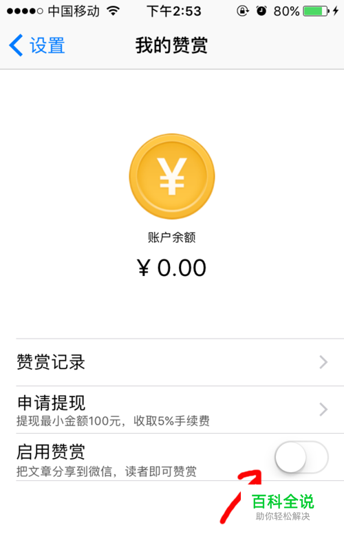 3.点击“启用赞赏”会跳出提示,点同意,成功开启后按钮显示为绿色;