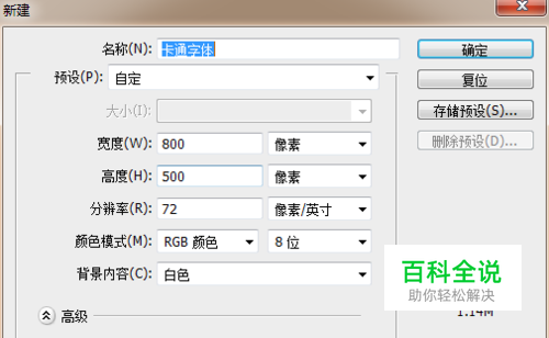 新建一个800*500尺寸,分辨率为72的画布,命名为卡通字体,如图所示。