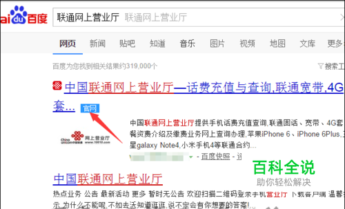 这里是电脑中没有安装宽带我世界。直接在搜索栏中输入联通网上营业厅,就可以在下面的链接中看到有一个官网。点击打开这个官网。