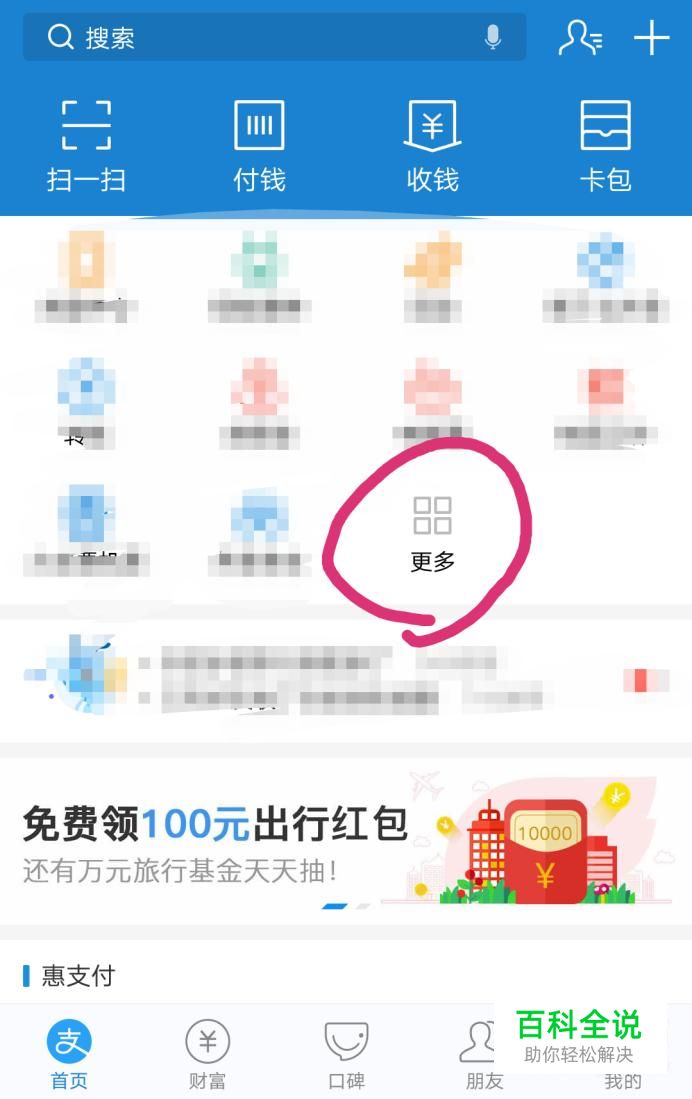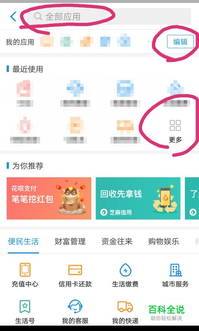 点击进入支付宝页面,不仅有最近使用的应用,也有有下图圈出更多选项,点击进入