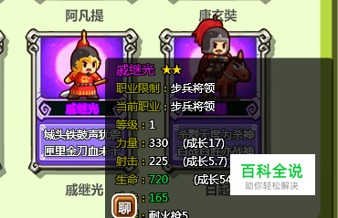 戚继光是明朝抗倭名将,他创建戚家军、南平倭寇、北御蒙古,是我国杰出的军事家、书法家、诗人、民族英雄。在村长征战团网页游戏里,玩家不仅能拥有戚家军这强大的军队,还可以招募戚继光这样强悍的武将,帮助你征战天下。那村长征战团戚继光武将如何获取呢? 村长征战团戚继光属于紫色系列武将里的一员,戚继光是有职业限定的,它的职业限定要求为步兵将领。无论你为戚继光佩戴任何装备,它也只能站在步兵队列里。因此,建议大家为戚家军佩戴上肉盾类型的装备,这样他能为你步兵队伍抵挡更多伤害。村长征战团戚继光的基础属性介绍,如下: 职业限制:步兵将领; 等级:1级; 力量:330(成长17); 射击:225(成长:5.7); 生命:720(成长54); 攻击:165; 技能:耐火枪5; 主将技:战盾3。 村长征战团戚继光武将的获得方法有3种,分别有:1、武将招募系统招募,有较低几率会抽中戚继光武将卡;2、在蓝玉宝殿里使用20000点蓝玉牌兑换;3、在将魂宝殿使用4800将魂值兑换。其中,使用蓝玉牌所兑换的戚继光只能得戚继光武将,而无法获得戚继光的武将卡,建议大家选择两种方法获取戚继光会划算一些。因为这两种方法不仅能获得戚继光的武将,还能该武将卡,可在卡牌系统里激活一些卡牌组合属性。 玩家获得戚继光的时候,戚继光就是进阶2星的1级武将。玩家还能利用金币、戚继光碎片等材料,来提升该武将的等级、进阶等级,让戚继光变得更强一些。
