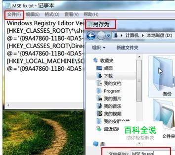 打开记事本,复制粘贴以下注册表信息: Windows Registry Editor Version 5.00 [HKEY_CLASSES_ROOT\*\shellex\ContextMenuHandlers\EPP] @="{09A47860-11B0-4DA5-AFA5-26D86198A780}" [HKEY_CLASSES_ROOT\Directory\shellex\ContextMenuHandlers\EPP] @="{09A47860-11B0-4DA5-AFA5-26D86198A780}" [HKEY_LOCAL_MACHINE\SOFTWARE\Classes\Drive\shellex\ContextMenuHandlers\EPP] @="{09A47860-11B0-4DA5-AFA5-26D86198A780}" 然后将文件另存为“MSE Fix.reg”,注意扩展名为reg,保存类型为“所有文件(*.*)”,而非“文本文件(txt)”。