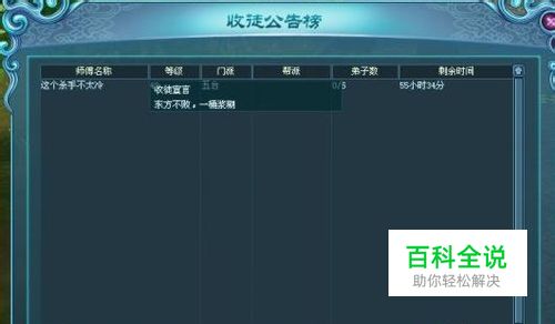 在各城镇的“拜师迎徒”处,可以开启公告板进行“拜师”和“登记收徒”操作。作为一个等级<30的玩家,可以主动向等级≥30的玩家拜师,以便在遇到困难时让师父帮助你快速地渡过难关。在各城镇的“拜师迎徒”处开启 “收徒公告板”。在“收徒公告板”中选择中意的拜师对象,使用“拜师”向对方发出拜师申请。