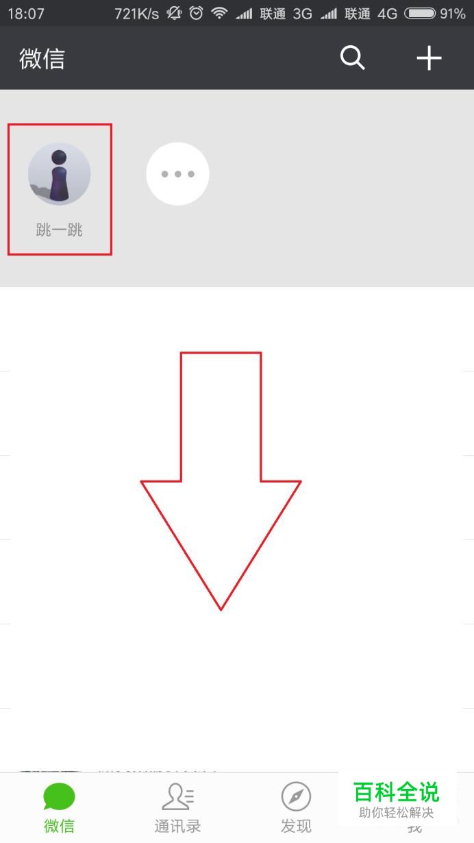 在微信消息窗口主页面,点击页面窗口向下拉,直至打开小程序窗口,可以看到“跳一跳”小程序。