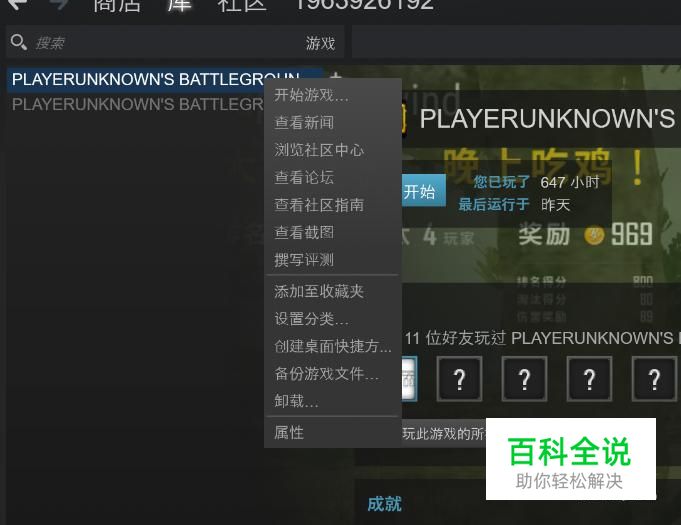启动steam之后,找到自己的游戏,比如我这个是绝地求生,然后我们需要右键单击,之后图弹出一个对话框