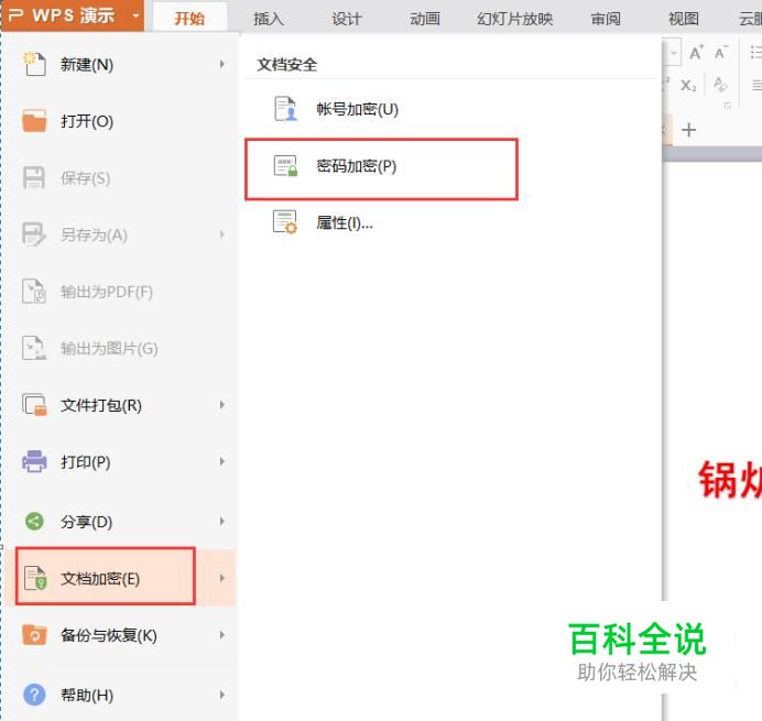 如果当前可以浏览PPT文件的内容,只是不能编辑文件的话,点击软件主页面菜单,选择“文档加密-密码加密”选项。