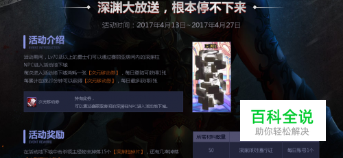 活动期间,Lv70及以上的勇士们可以通过赛丽亚房间内的深渊柱NPC进入活动地下城,每次进入活动地下城消耗一张次元移动券,每日登陆可获得1张。每累计在线20分钟可以获得次元移动券,每日最多获得3张。 根据活动规则,每位玩家一天最多用4张次元移动券,所以对应的深渊柱一天最多刷四次。