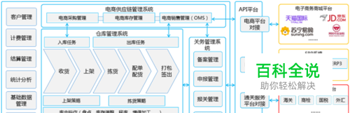 电商销售管理即订单管理系统(OMS),包括全渠道订单对接管理、跨境进口销售订单管理、套餐管理、拆单合单管理、分仓管理、物流渠道管理、退货管理、换货管理、售后跟单管理等功能。 仓库管理系统(WMS),包括货位管理、出入库策略管理、库存归并策略管理、收货管理、上架管理、波次拣货管理、配单配货管理、打包管理、出库管理、盘点管理、库存调整管理、移库管理等功能。 关务管理系统(CMS),包括企业备案管理,商品备案管理、账册备案管理、申报管理、报关管理、税单查询管理等功能。 核算与结算管理系统(BMS),包括标准价格管理、合同管理、计费方案管理、充值管理、对账单管理,核销管理、总账管理等功能。 客户关系管理系统,包括客户档案管理、店铺管理、客户货品管理、收发货地址管理、客户服务管理等功能。 统计分析系统,包括业务数据、作业数据、财务数据等统计分析功能。 应用系统集成(API)平台,系统通过统一API平台与电子商务商城平台、电子商务ERP、物流渠道、跨境电商通关服务平台对接,实现商流、物流、信息流互联互通。 物流作业辅助系统集成,系统可集成移动手持终端系统、电子标签拣货系统、移动拣货车系统、自动化拣货系统、电子标签打印系统等物流作业辅助系统。