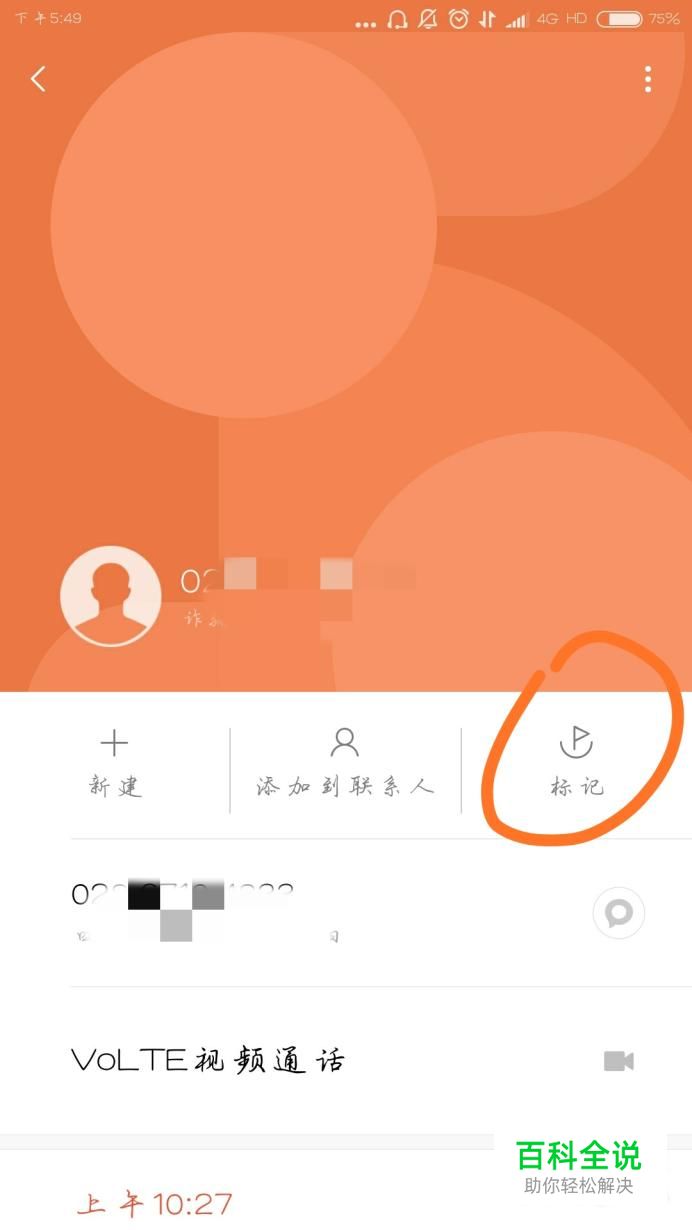 点击进入你想要进行标记的电话号码,然后点击“标记”,如下图所示
