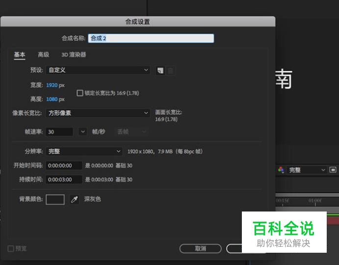 打开电脑中的AE软件,ctrl+N先新建一个合成,时间不用太长,帧速率为30f就行了。
