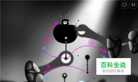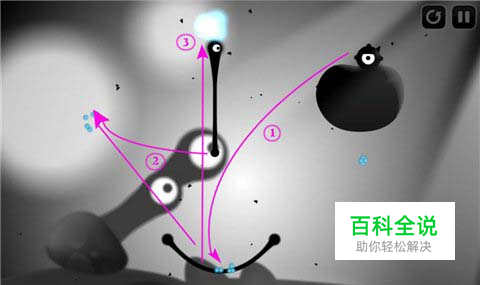 1、让眼睛滚动下去落到弹绳上。 2、如图所示,标识2是两条线,也就是这两个动作必须一气呵成。将眼睛抛向左边小光球处,然后迅速用上方弹绳接住眼睛。摆动过程中能拾取右边小光球。 3、再将眼睛垂直放回下方弹绳中,再向正上方发射出去得到大光球。