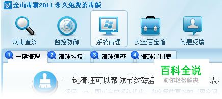 一键解决办法:使用金山毒霸2011系统清理界面中的一键清理功能。