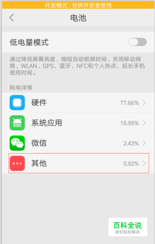 在电池显示的列表中,点击“其他”,找到需要防清理的后台服务应用,这里选择了秀壁纸